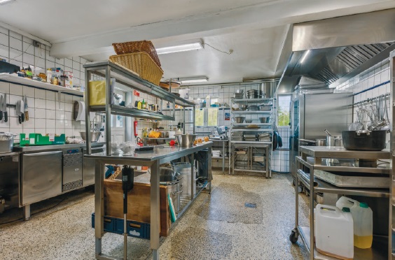 Restaurationsdelen fremstår funktionel og klar til drift og omfatter bl.a.: